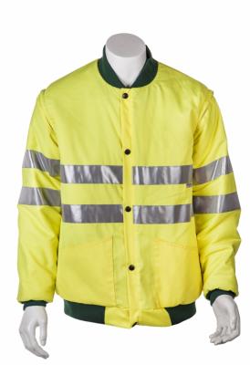 Prenda corta de alta visibilidad para frío. Cierre mediante broches de presión, mangas desmontables, dos bolsillos laterales con abertura oblicua, cuello y cinturilla de tejido canalé elástico, interior forro acolchado con Thinsulate.