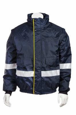 Prenda corta para frío. Mangas desmontables, cremallera central cubierta con tapeta, dos bolsillos laterales horizontales cubiertos con tapeta y broches de presión, capucha con ajuste de cordón elástico y ceñidores, oculta en cuello mediante cremallera, interior forro acolchado con guata de 120 grs y bolsillo.