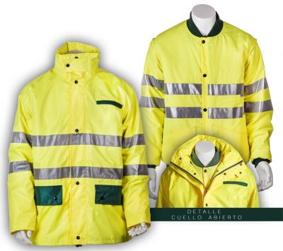 Prenda amplia para frio, cerrada mediante cremallera cubierta con doble tapeta, con broches de presión. Dos bolsillos laterales cerrados mediante cremallera ocultos con tapetas. Cordón de ajuste en cintura con ceñidores. Dos bandas de reflectante en tronco y brazos. Puños cortavientos en interior de la manga. Capucha oculta en cuello, con ajuste mediante cordón y ceñidores,. Costuras termoselladas.