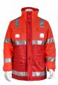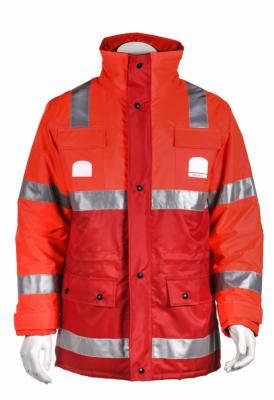 Prenda amplia para frío de alta visibilidad, cerrada mediante cremallera cubierta con doble tapeta, con broches de presión. Cuatro bolsillos, dos superiores y dos inferiores cerrados con tapeta. Cordón de ajuste en cintura con ceñidores. Dos bandas de reflectante en tronco, brazos y tirantes. Puños cortavientos en interior de la manga. Capucha oculta en cuello, con ajuste mediante cordón y ceñidores,. Costuras termoselladas.