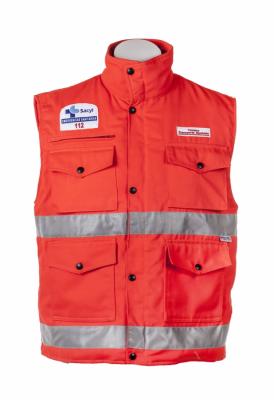 Chaleco alta visibilidad, multibolsillo. Cerrado mediante cremallera oculta con tapeta y broches de presión. Dos bolsillos inferiores , con acceso vertical y horizontal y tres en pecho. Dos bandas de reflectante. Forro interior acolchado.